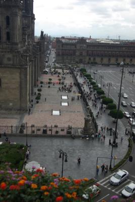 Anreise war Freitagabend in das - standesgemäße - Holiday Inn - direkt am Zocalo, dem Zentralplatz der Stadt. Die Aussicht von der Frühstücksterrasse auf denselbigen am nächsten morgen: